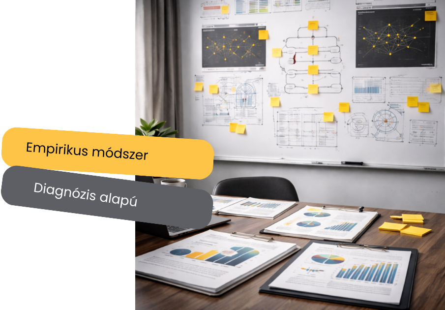 Nem kész megoldásokat „szállít”, hanem kutatásalapú diagnózist végez, empirikus adatgyűjtésre és validált modellezésre építve.
